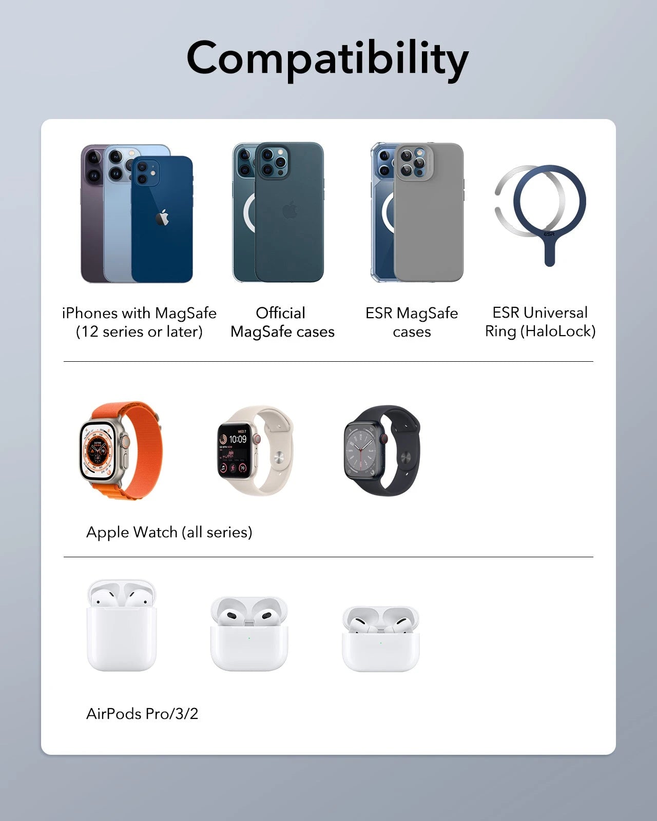 Official MagSafe and Apple Watch certification let you charge your iPhone at 15W and Apple Watch at 5W, twice as fast as non-certified chargers. That means safer, more reliable charging at faster speeds and your everyday essentials fully charged even quicker.