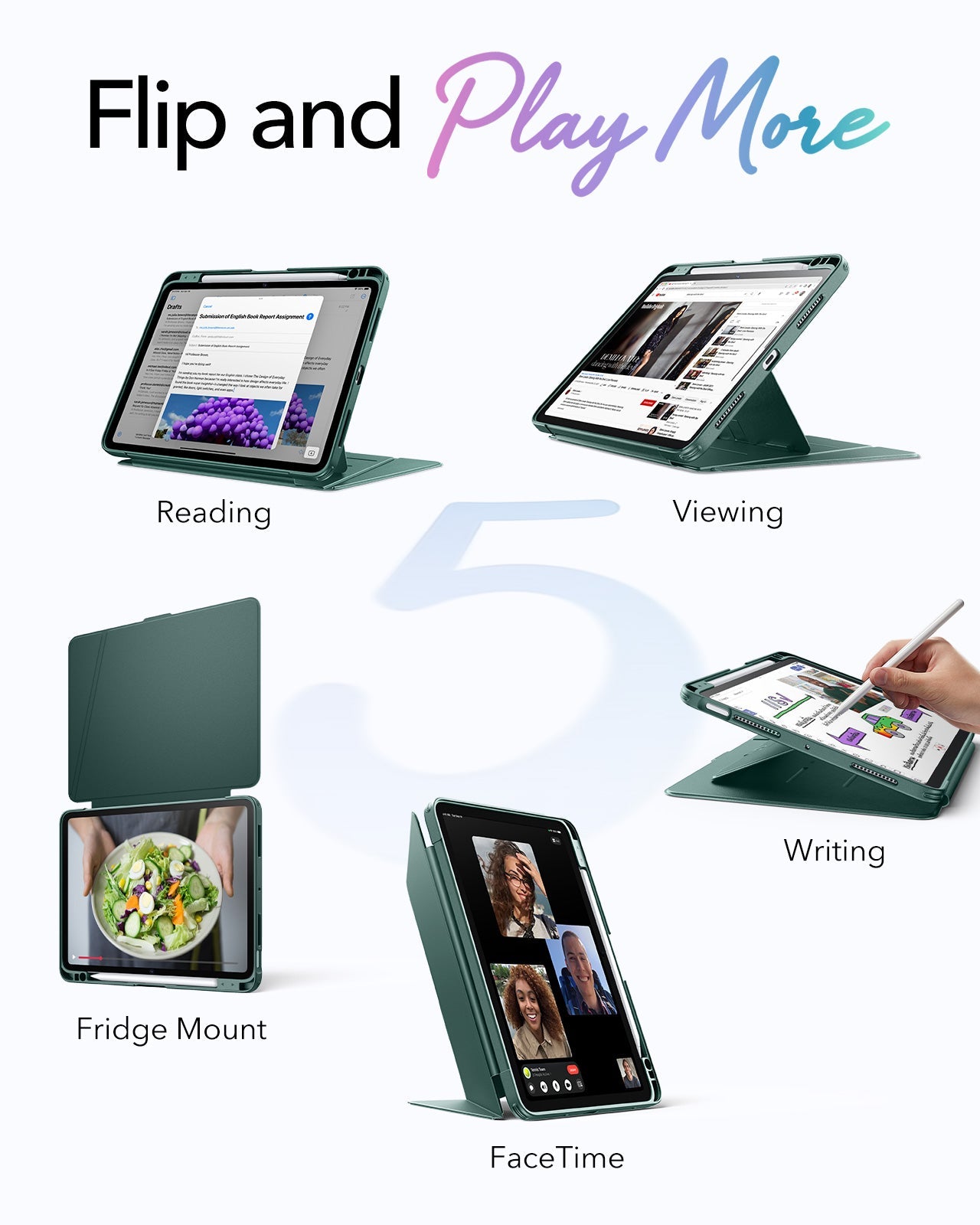Drei Aufstellwinkel im Querformat bieten die perfekte Position für alles – Filme schauen, schreiben oder Videoanrufe. Im Hochformat eignet sich die Hülle ideal zum Browsen. Der Stifthalter stört nicht beim magnetischen Laden und bleibt auch auf weichen Unterlagen wie Sofa, Bett oder Schoß überraschend stabil – kein Verrutschen mehr.