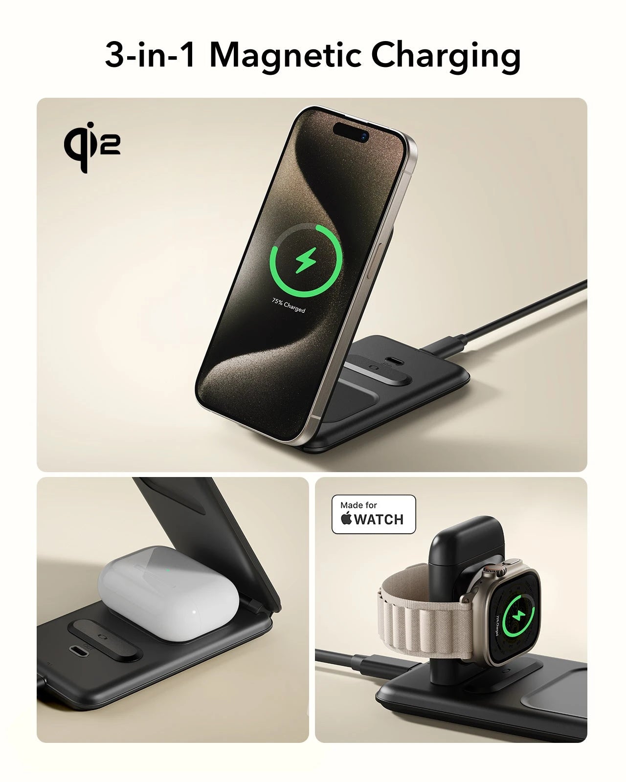 Faltbares und tragbares kabelloses All in One Ladegerät mit 15 W Qi2 Schnellladung für iPhone, magnetischer kabelloser Ladung für AirPods und abnehmbarem 5 W Made for Apple Watch Ladegerät