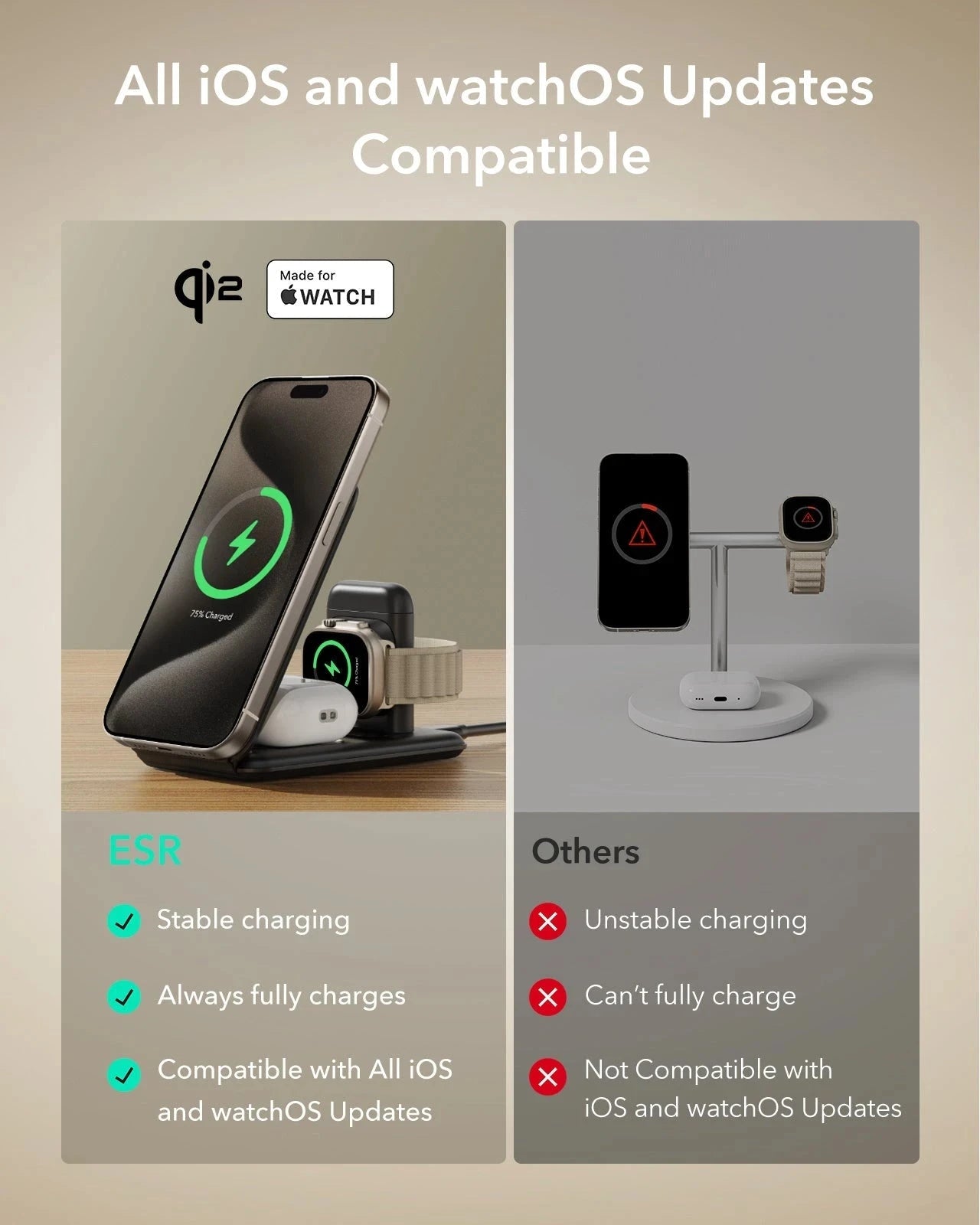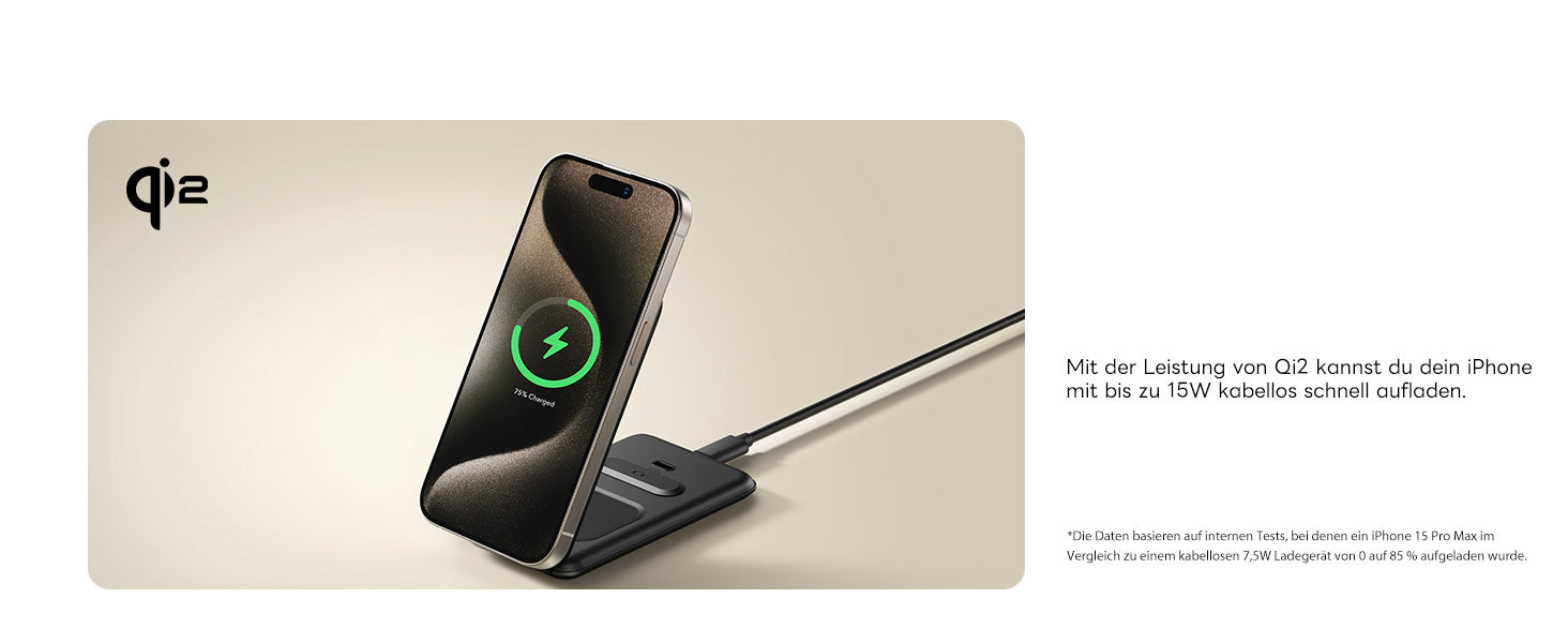 Faltbares und tragbares kabelloses All in One Ladegerät mit 15 W Qi2 Schnellladung für iPhone, magnetischer kabelloser Ladung für AirPods und abnehmbarem 5 W Made for Apple Watch Ladegerät