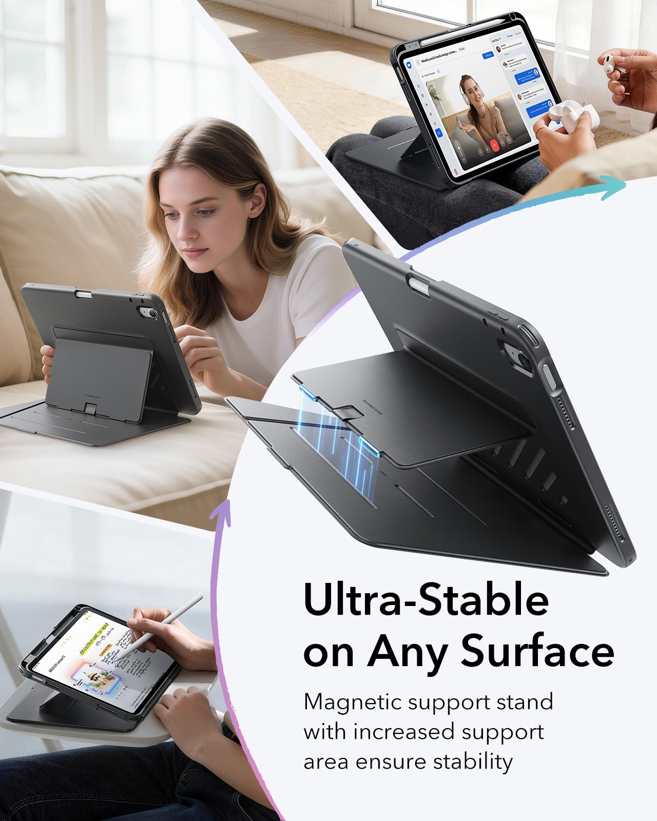Drei Aufstellwinkel im Querformat bieten die perfekte Position für alles – Filme schauen, schreiben oder Videoanrufe. Im Hochformat eignet sich die Hülle ideal zum Browsen. Der Stifthalter stört nicht beim magnetischen Laden und bleibt auch auf weichen Unterlagen wie Sofa, Bett oder Schoß überraschend stabil – kein Verrutschen mehr.