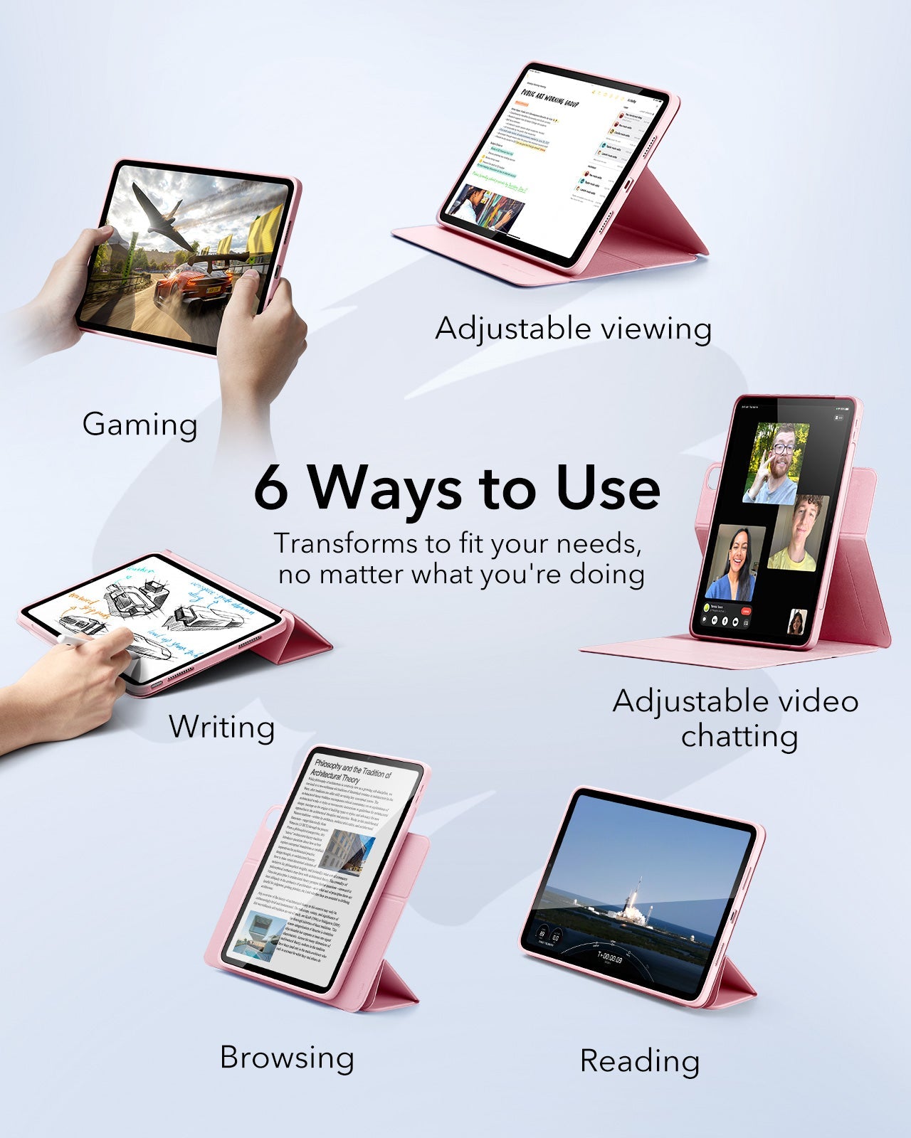 Vielfältige Nutzungsmodi: Verwandle dein iPad für jede Aufgabe mit 6 einzigartigen Modi, einschließlich einstellbarer Hoch- und Querformat-Positionen.