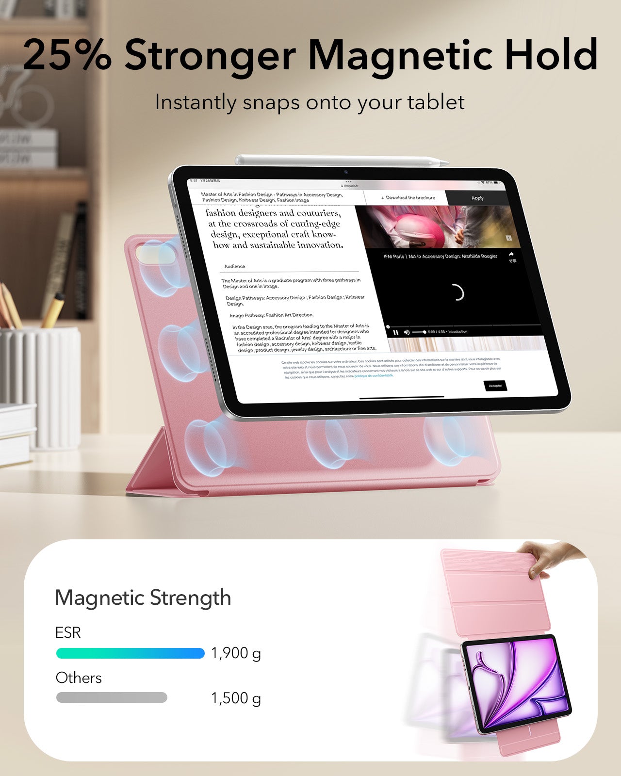 This iPad case features a strong magnetic attachment, durable materials for long-lasting use, and full support for Apple Pencil Pro with wireless charging compatibility. Its slim, lightweight design offers easy portability, while the front cover doubles as a stable stand for viewing, typing, and drawing.