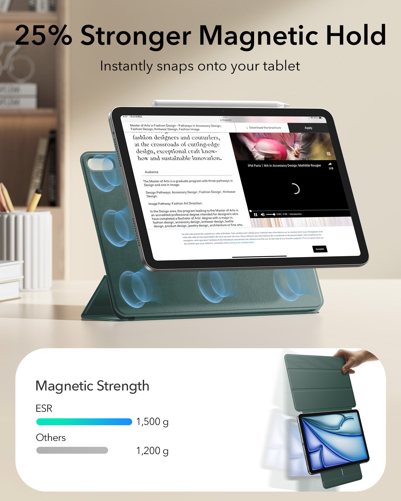 This iPad case features a strong magnetic attachment, durable materials for long-lasting use, and full support for Apple Pencil Pro with wireless charging compatibility. Its slim, lightweight design offers easy portability, while the front cover doubles as a stable stand for viewing, typing, and drawing.