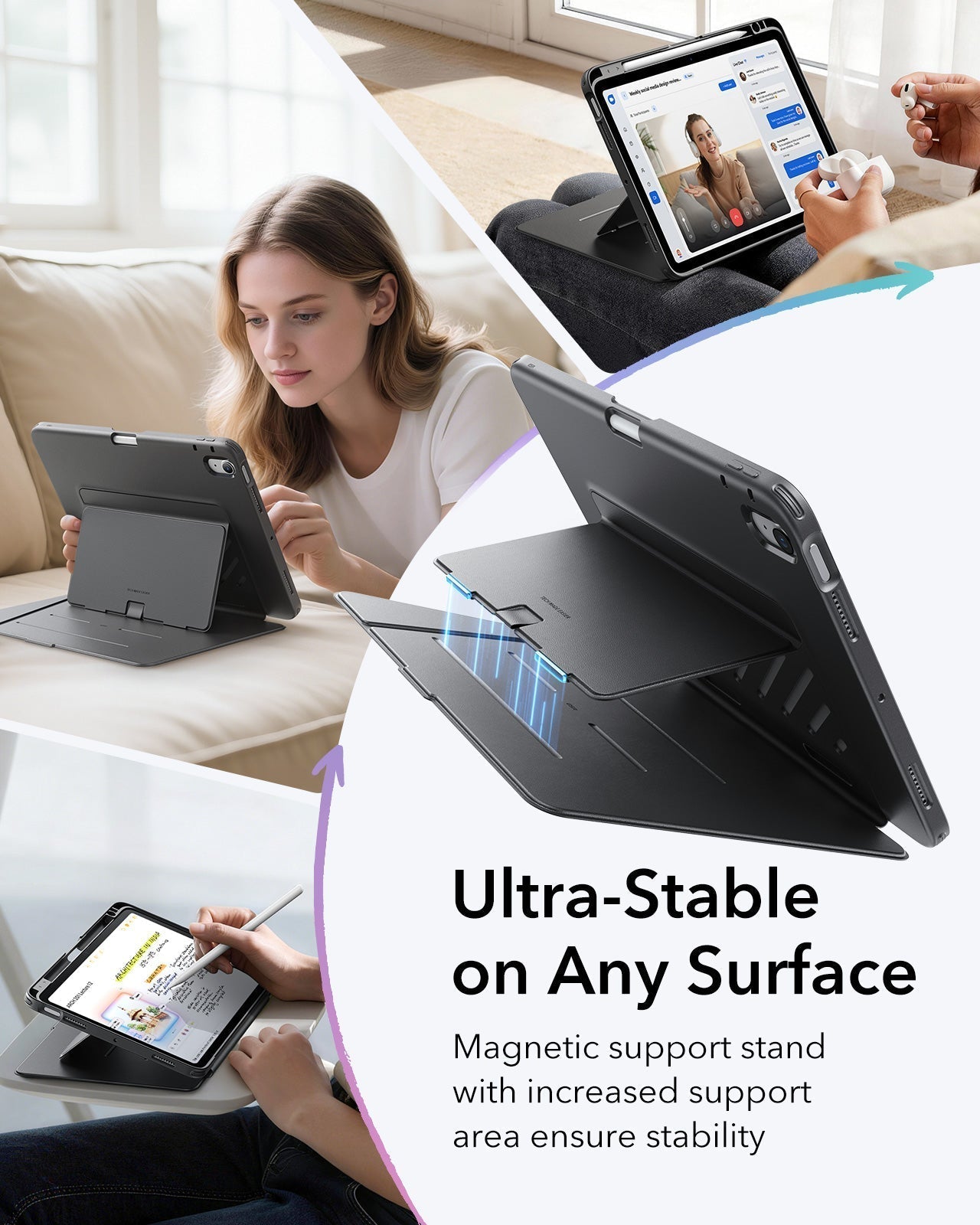 Support ultra-stable : la base magnétique solide garde votre iPad stable même sur des surfaces molles comme vos genoux, canapé ou lit