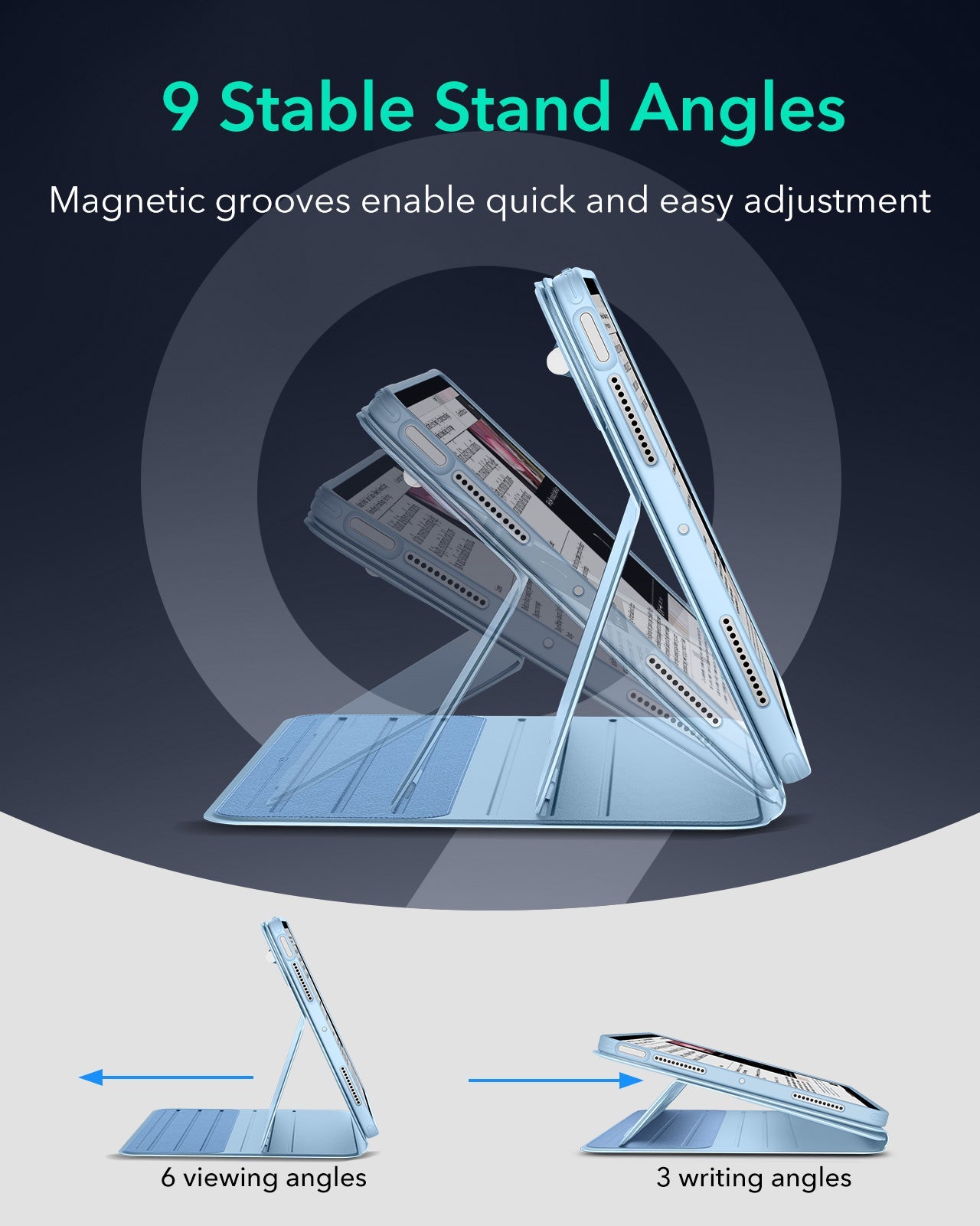 The all-in-one magnetic iPad case with a detachable stand gives you 6 viewing angles and 3 writing angles. Easily switch between portrait and landscape, while keeping your iPad fully protected for work, creativity, and entertainment.