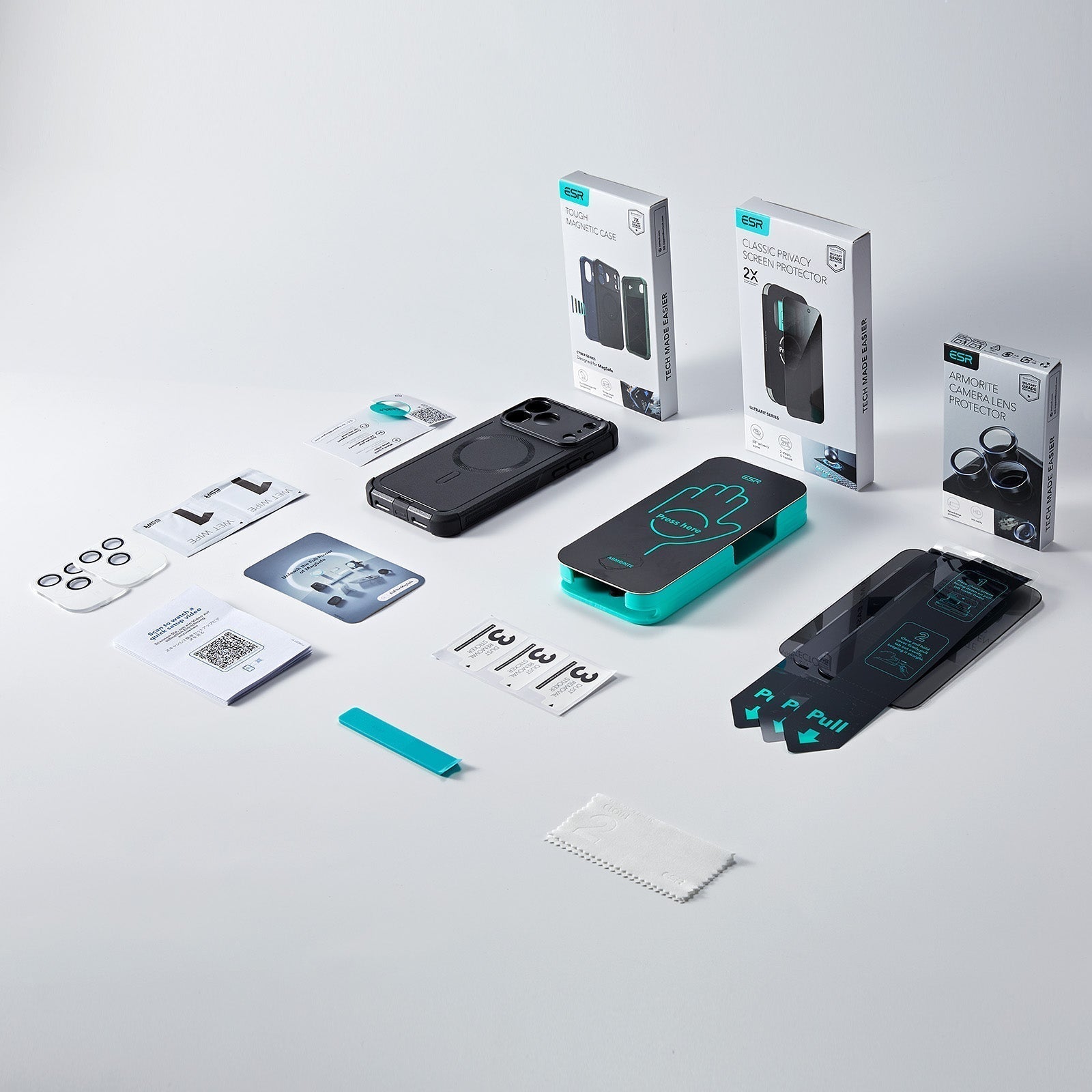 In the Box: 1 magnetic phone case / 3 privacy screen protectors / 2 sets of lens protectors (colors: Clear & Black)