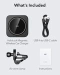 What’s Included: HaloLock Magnetic Wireless Car Charger, air vent clip, 3.3 ft (1 m) USB-A to USB-C cable, and manual; car charging adapter not included